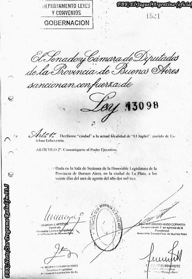 La Ley numero 13.098 decia " El Senado y la Camara de la Provincia de Buenos Aires sancionan con fuerza de Ley que se declare Ciudad a la localidad de El Jagüel del partido de Esteban Echeverria".